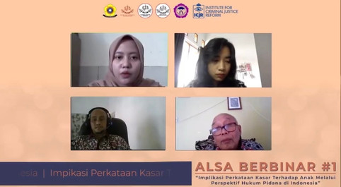 ALSA BERBINAR # 1 has the theme "Implikasi Perkataan Kasar Terhadap Anak Melalui Hukum Pidana Indonesia". ALSA BERBINAR # 1 was carried out through the ALSA LC Unsri Youtube Live Streaming and was open to the public. The speakers for ALSA BERBINAR # 1 were Prof. Dr. I Dewa Putu Wijana, S.U., M.A. (Professor of Linguistics, Faculty of Humanities, Universitas Gajah Mada); Andi Lian, S.H., M.H. (Head of the Advocacy and Legal Reform Division of the Central Indonesian Child Protection Agency); Genoveva Alicia, S.H. (Researcher at the Institute for Criminal Justice Reform).