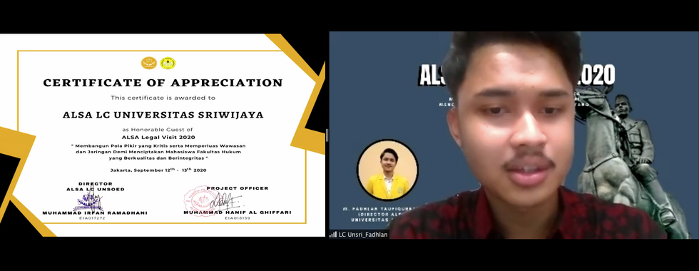 ALSA Legal Visit is a work program by the Law Development Division and External Affairs Division of ALSA Local Chapter Universitas Jendral Soedirman. This event aims to increase the participants' legal knowledge as this division which focuses on the development of the member' legal knowledge. This year, ALSA Legal Visit Unsoed was having collaboration with ALSA lc unsri. Because of the Covid-19 pandemic situation, this legal visit was held online through the Zoom meeting platform. This activity was carried out on Saturday-Sunday, September 2th-13th, 2020. With the theme "Get know more about legal studies" and the title "membangun pola pikir yang kritis serta memperluas wawasan dan jaringan demi menciptakan mahasiswa fakultas hukum yang berkualitas.". On the first day, it contained seminars and a visit activity on the second day, where alsa lc unsri and alsa lc unsoed exchange knowledge and innovations from each local chapter so that members are expected to have a critical thinking pattern and also a bond between fellow members of the local chapter.